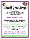 The St. Vincent de Paul Society of Incarnation of Our Lord Parish is sponsoring its third annual MARDI GRAS BINGO on Sunday, February 7, 2016. This fundraising event will be held in the Labuda Social Hall in the church basement. Doors will open at 12:0pm, and bingo will start at 2:00pm. The ticket price includes 15 bingo cash prize games. Five Vera Bradley/Coach special games, food, Tricky Tray Raffle, and Mardi Gras Mask Raffle will be available for purchase.
