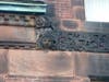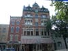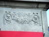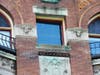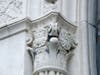 This building yielded an interesting surprise when we subjected it to the scrutiny of our zoom lens. That the corners of the facade are graced with twin personified suns came to our notice years ago, but a closer view reveals those faces appear to be, most curiously, those of satyrs.