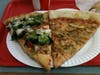 The veggie slice was loaded with vegetables. There were broccoli florets, mushrooms, green peppers, tomatoes, red onions and spinach. It was like a full day's serving of vegetables on top of my slice. This slice featured a thicker Sicilian style crust, which was crisp on the bottom and doughy on the inside. This heartier crust accommodated the abundant vegetables nicely. I wished for a touch more sauce and cheese, but I guess the lack of tons of cheese made for a healthier slice in general.