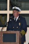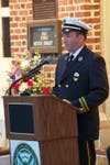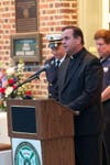 The crowd learned of an old fire company tradition dating back to the era a bell sounded the fire alarm and the return of the firefighters after their work was done. Four Fives is the ringing of a fire bell five times with four repetitions. What once signaled the firefighters' return to station has become a remembrance of fallen first responders. Dan Hemcher, a 14-year veteran Bryn Mawr firefighter and former assistant chief rang the bell. The crisp clangs of the bell seemed to fit well.
