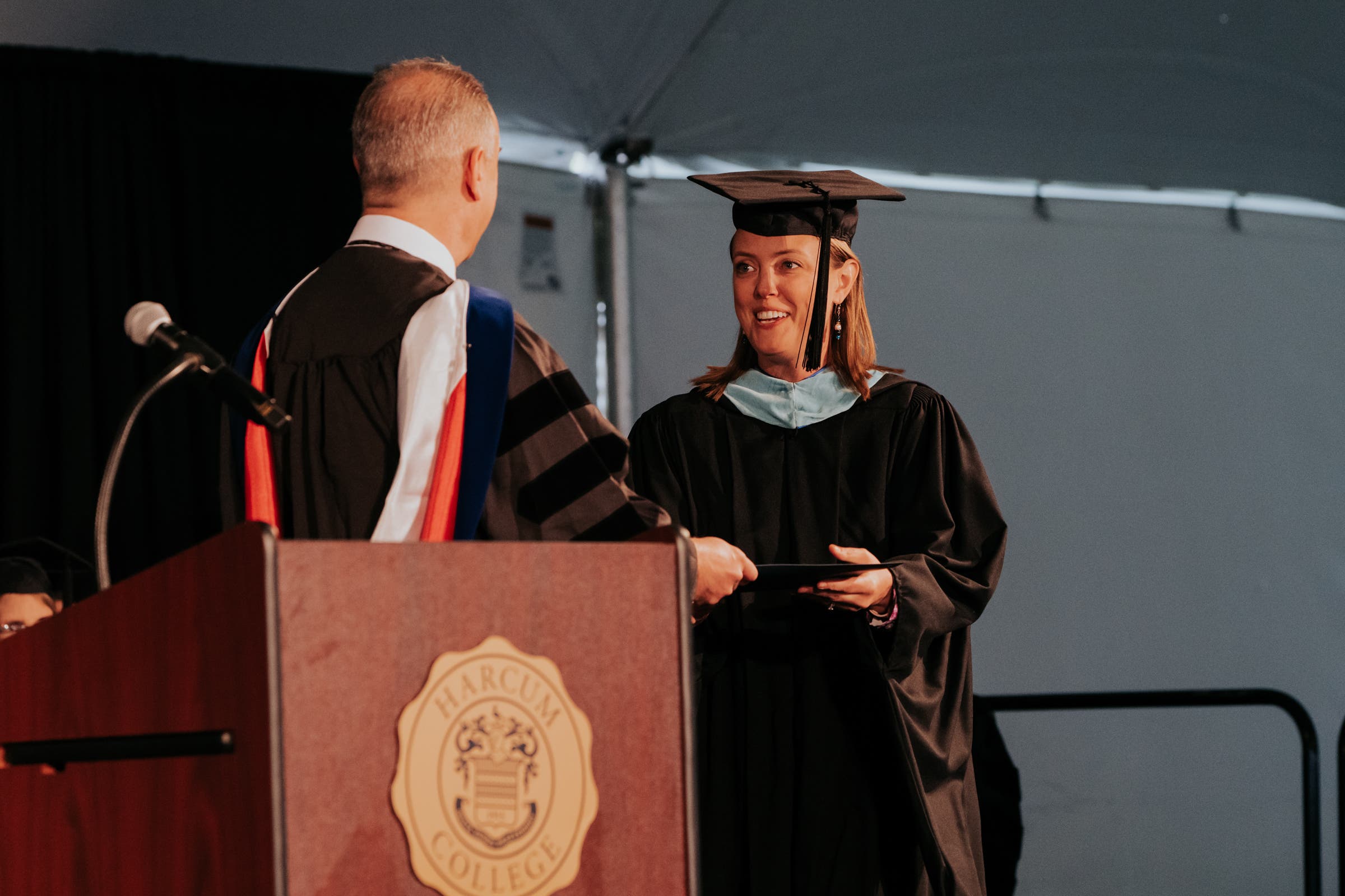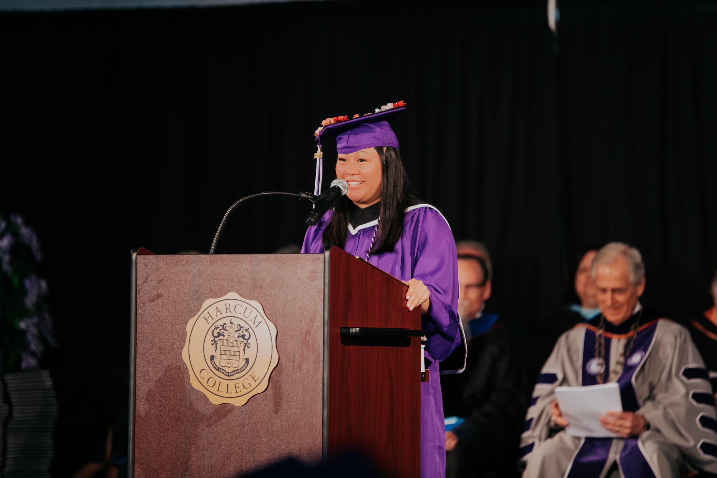 eagerly interacted with prospective students and their guests at our fall and spring Open Houses, sharing her experiences, insights, and love for Harcum College. She delivered a thoughtful, reflective, and meaningful student Commencement address at Saturday's event for her