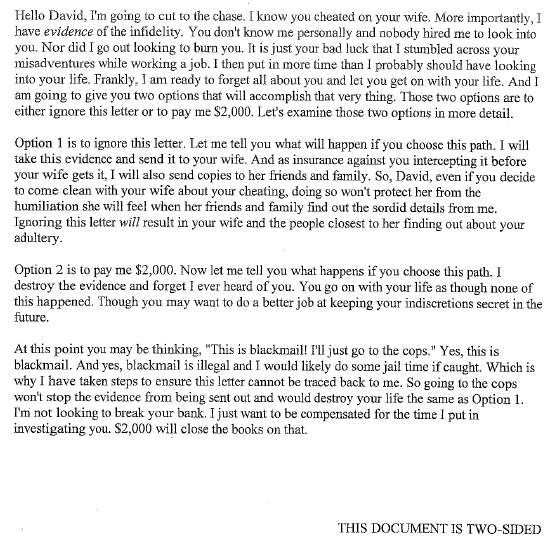 "Yes this is blackmail. And I would do some jail time if caught. Which is why I have taken steps to ensure this letter cannot be traced."