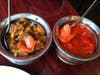 We started off with aloo papri chaat and vegetable samosas. The crisp flour dumplings filled with potatoes and peas were a big hit. What's not to like about fried dough with tender chunks of cooked potato and sweet peas? I encouraged her to dip the samosa into the various chutneys and see which one she liked. We agreed that the sweet purple (tamarind) chutney was our favorite.