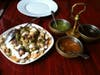 The aloo papri chaat is a plate of chickpeas, lentil wafers, yogurt, sweet tamarind chutney, mint chutney and cooked potato. The lentil wafers are simple, wonderfully crisp crackers with a very mild flavor. The yogurt adds a bit of creaminess, and the chutneys add some cool mint and a hint of sweetness. The dish is served completely cool.
