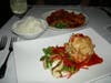 My medley of asparagus, snow peas, shiitake and fine ribbons of red bell pepper were exquisitely cooked and perfectly seasoned. Perhaps the first of our dishes to exhibit the “refined French flair” claimed on their Web site—I suspect there may have been a fair degree of butter involved. The shoestring potato crust on the bass was fried beautifully, but sadly at the expense of the fish which became overcooked and oil lodged.