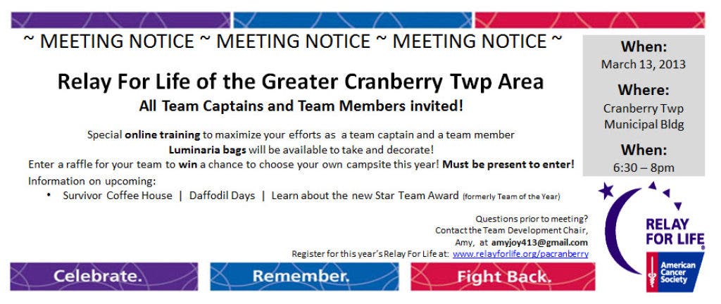 For information about forming a team, contact Molly at molly.walsh@cancer.org or visit our website www.relayforlife.org/pacranberry. Details about the 2013 Relay For Life can also be found on our local Relay website, as well as connecting with our Relayers via Facebook: www.facebook.com/pacranberry