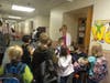 Students entering Haine were greeted by members of the βRed T-shirt Club,β a group of volunteers from the Parent Teacher Organization who directed students to their classrooms.