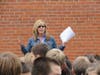 A large sign was attached to the school outside and students gathered under it to hear Barnes tell them about the honor and have their photos taken.