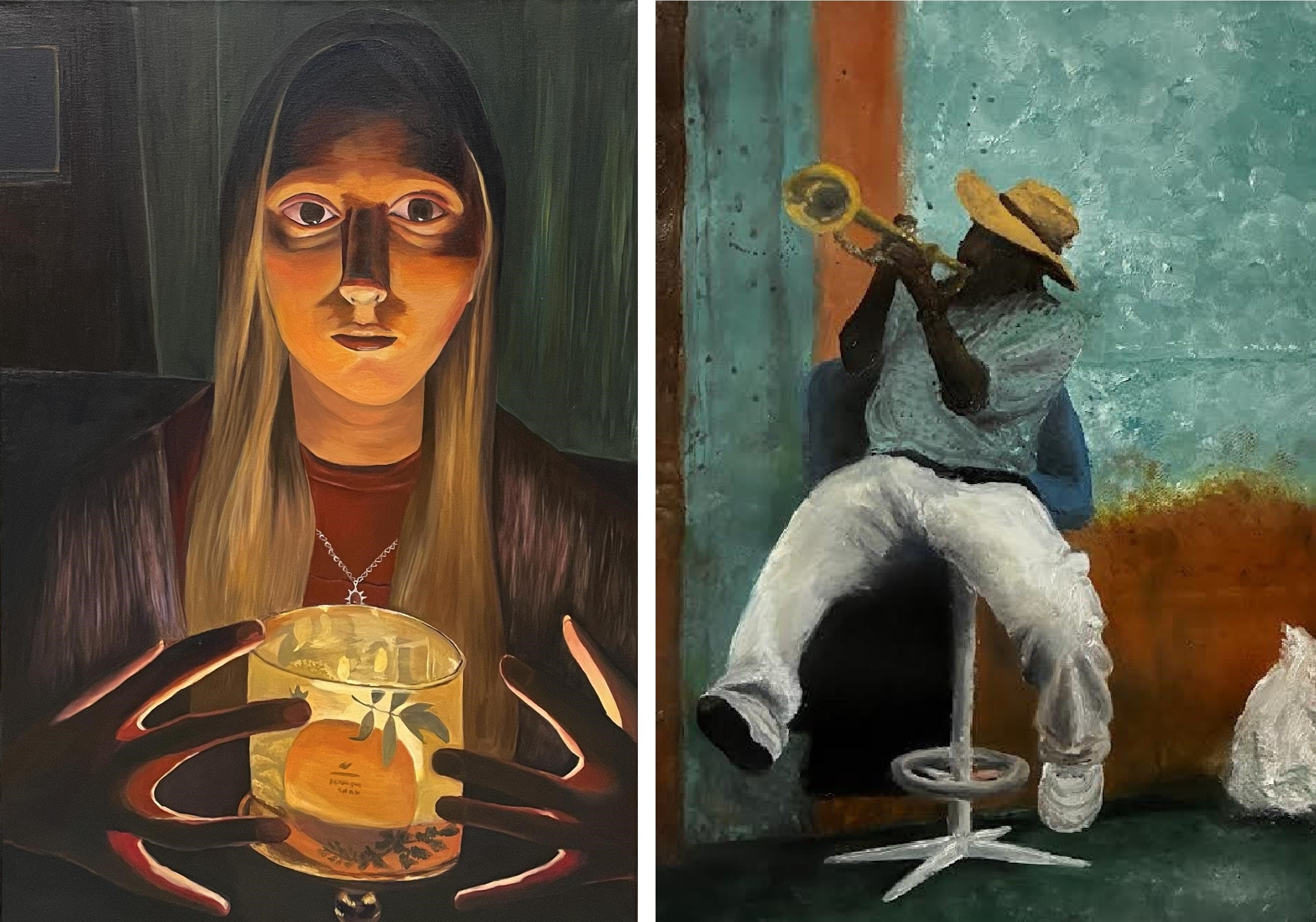 Aleksandra Nieznalska from Pennsbury won first place for her painting, "St. Andrew's Eve." Also winning first place is Sloan Miles from Solebury School for "Horn Player," a work on paper.