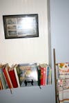 We also carved out a cookbook shelf and an antique wooden ladder, propped against a wall, holds vintage tea towels.