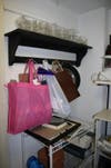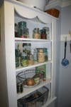 I was so lucky to stumble into Impact Thrift, a local secondhand store in our area, and find this perfect white antique jelly cabinet that had originally come from a store. The best part is that it fit exactly into the nook carved into one of the inside walls. Wow. We were lucky there. I quickly washed and filled every ball jar I had been saving for years and started my display of beans, nuts, grains, and even M&M’s for Mike. On lower shelves I placed wire baskets I once found at a yard sale. Filled them with onions and potatoes, even boxes of pasta.