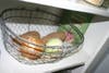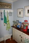 Next, take a look at the pegs holding pretty aprons and an egg basket. The lime green apron is a treasured gift and the expandable wire egg basket, another find, is waiting for some wooden eggs. (still hunting).