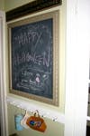 Just before you walk into the pantry we painted a rectangle with black chalkboard paint and framed it with a wooden frame, added an alphabet above and recycled pegs we had hanging in our other house across the bottom. The pegs neatly store the chalk, a hand-made cloth eraser, and a few kitty toys.