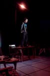 During the creatively-staged “Hundred Way Ballet,” Alvarez fantasizes about how she could kill Peterson. Reminiscent of a game of Clue, the characters, dressed in black with labels “poison,” “lead pipe,” and “rope,” torment Peterson. Just when he’s sure he’s fended them all off, a petite acrobat labeled “bomb” flips his way onto stage and explosively into the arms of Peterson to end the scene.