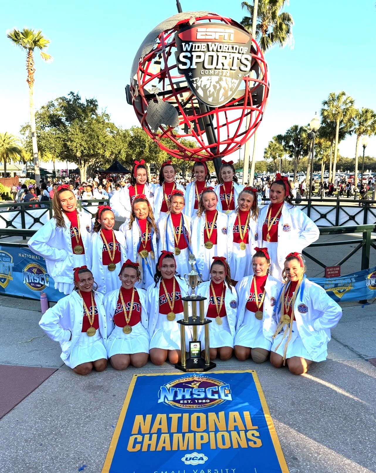 The CB East Cheer Team with its national trophy. (UCA National High School Cheerleading Competition)