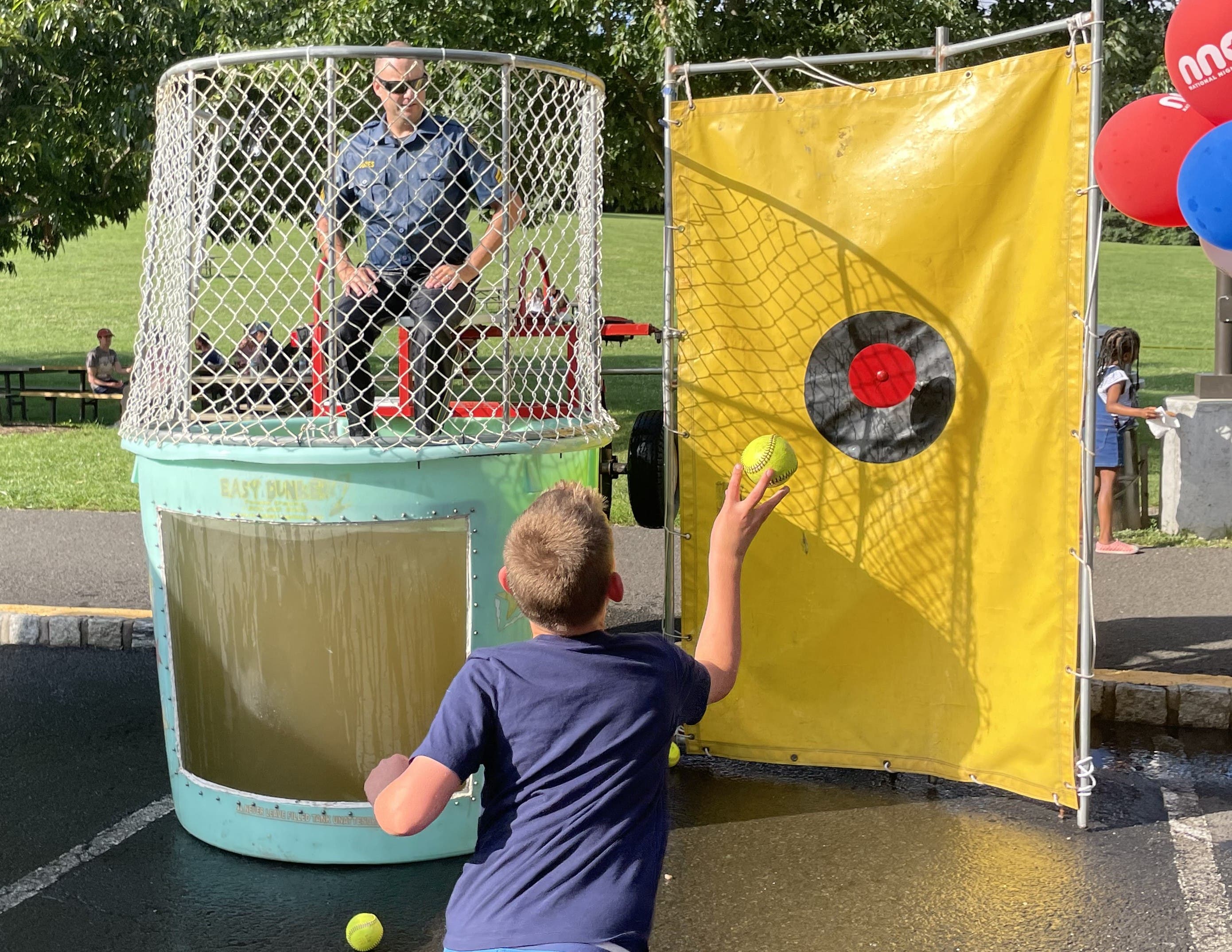 Over at the Doylestown Township booth, officers were literally making a splash for the victims of crime. They were taking turns in a dunk tank provided without charge by BucksMont Party Rentals with proceeds benefiting Victim Support Services.