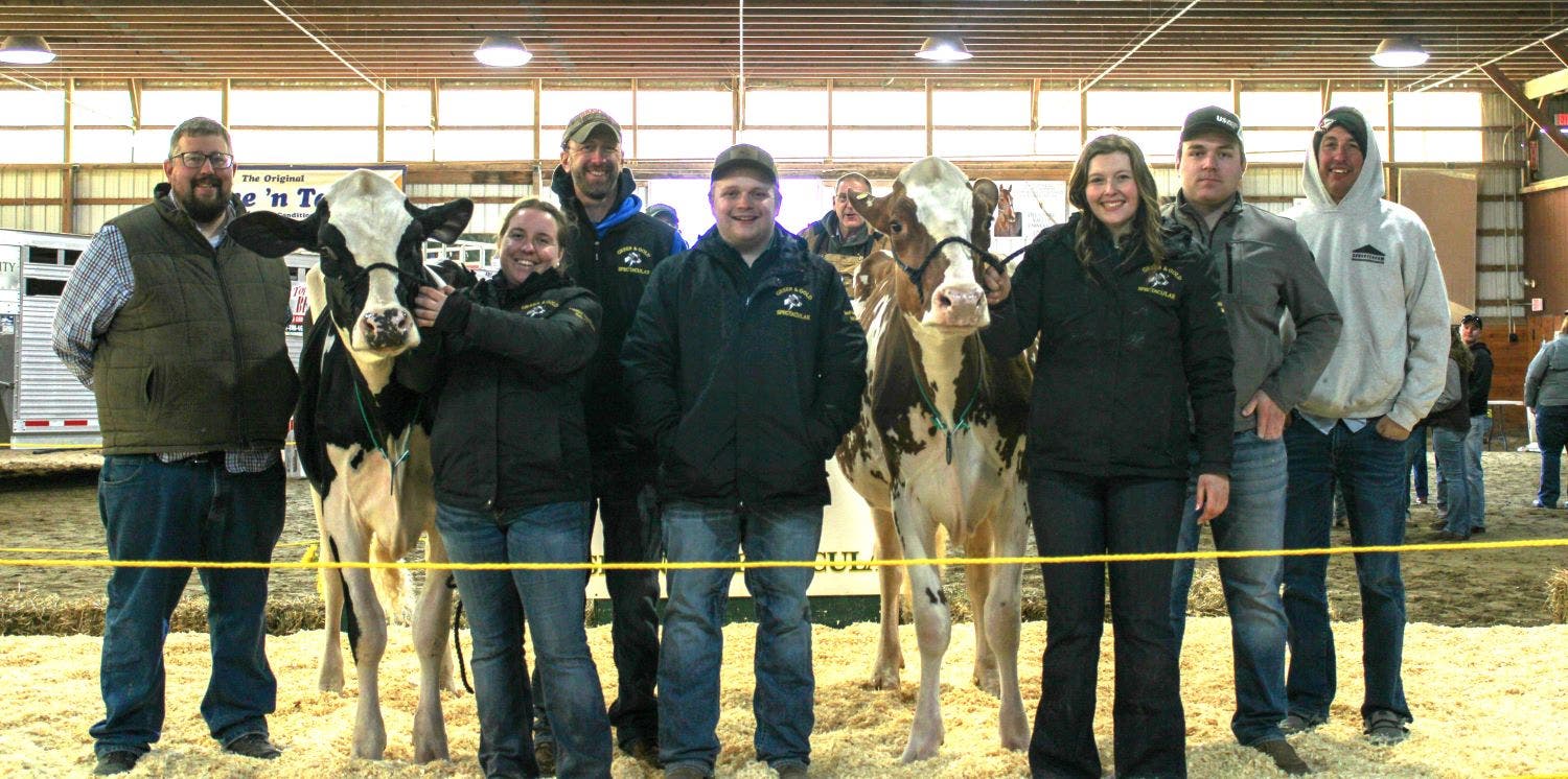 Dairy Society student sale chairs with the highest-selling cows from the Green and Gold Spectacular Dairy Sale. From left are: Brett Haines, Caitlyn VanDeusen '27, Josh Sanders '03, Jacob Vandoren '27, Nellie Hankinson '27, and Joshua Martin, Aaron Ray Tompkins).