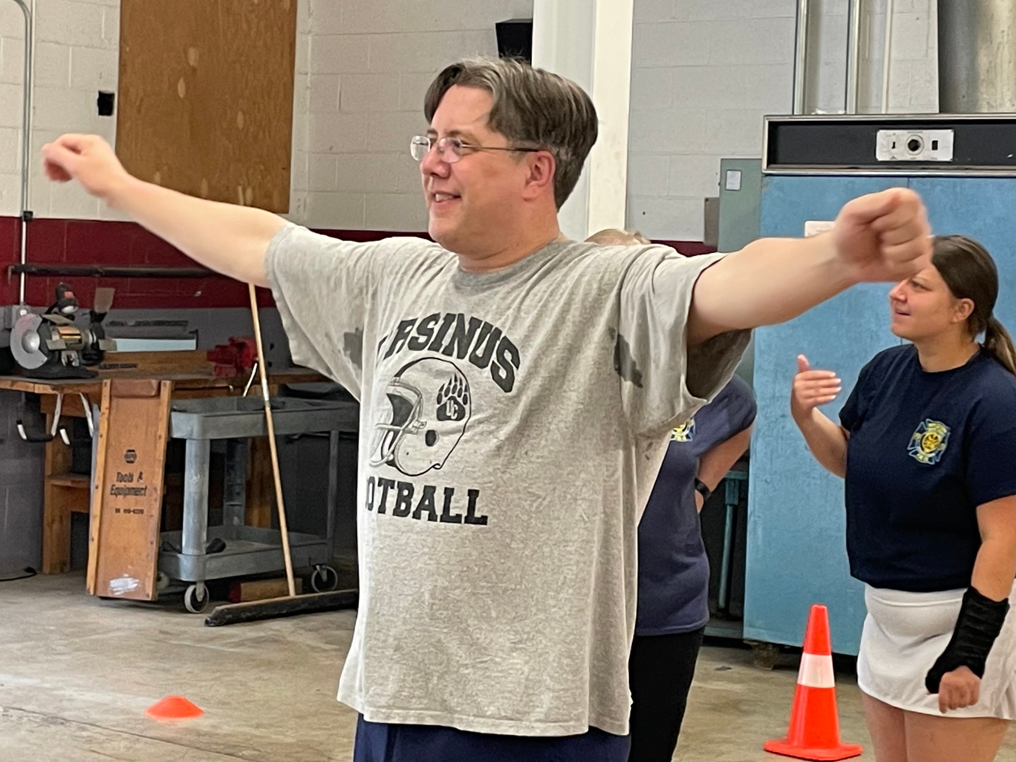 State Rep. Tim Brennan takes part in warm-up exercises before hitting the new gym.