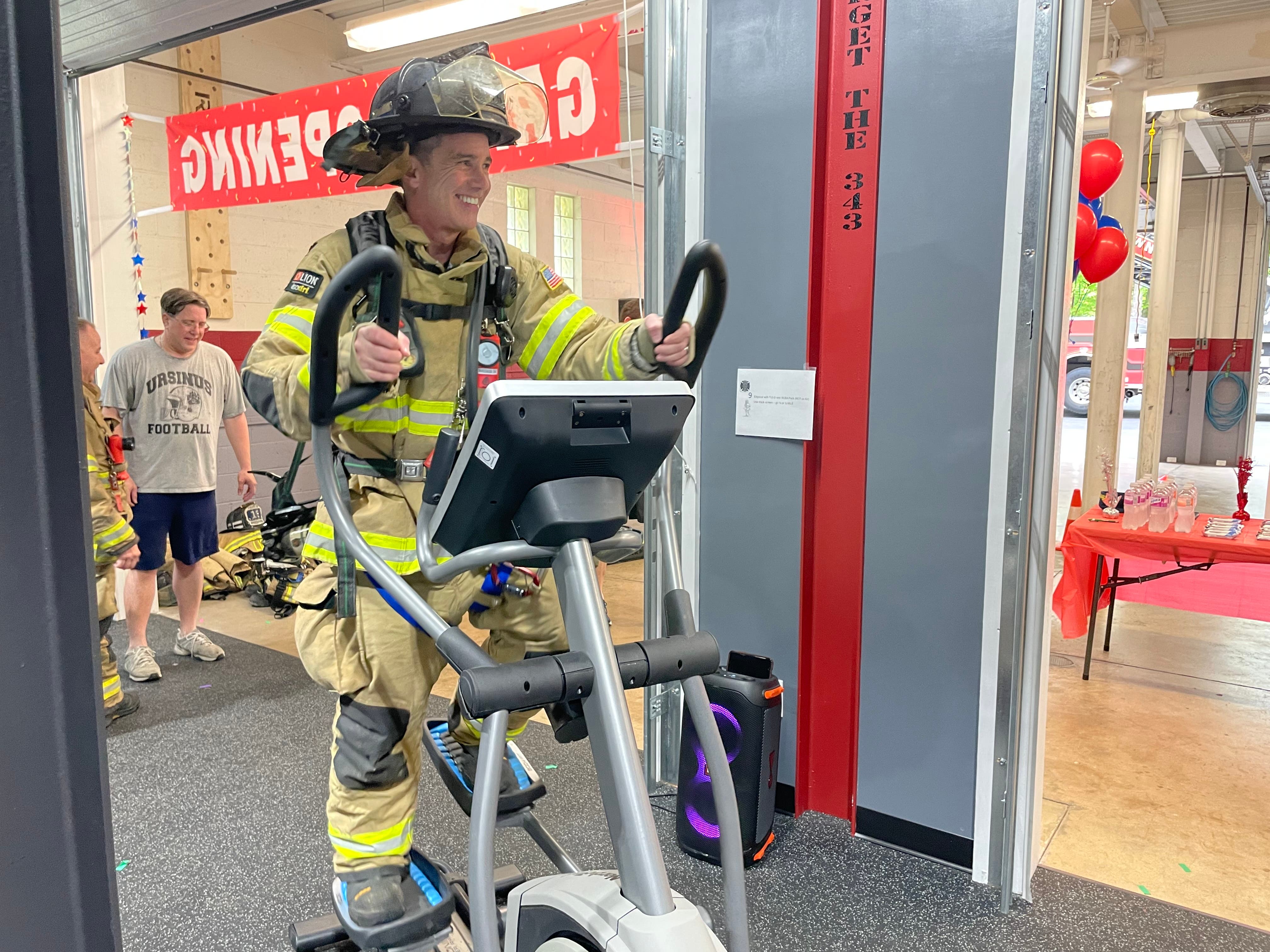 After trying out several pieces of equipment, Santarsiero and Brennan took a turn on the elliptical loaded down with a heavy air pack and turnout gear.