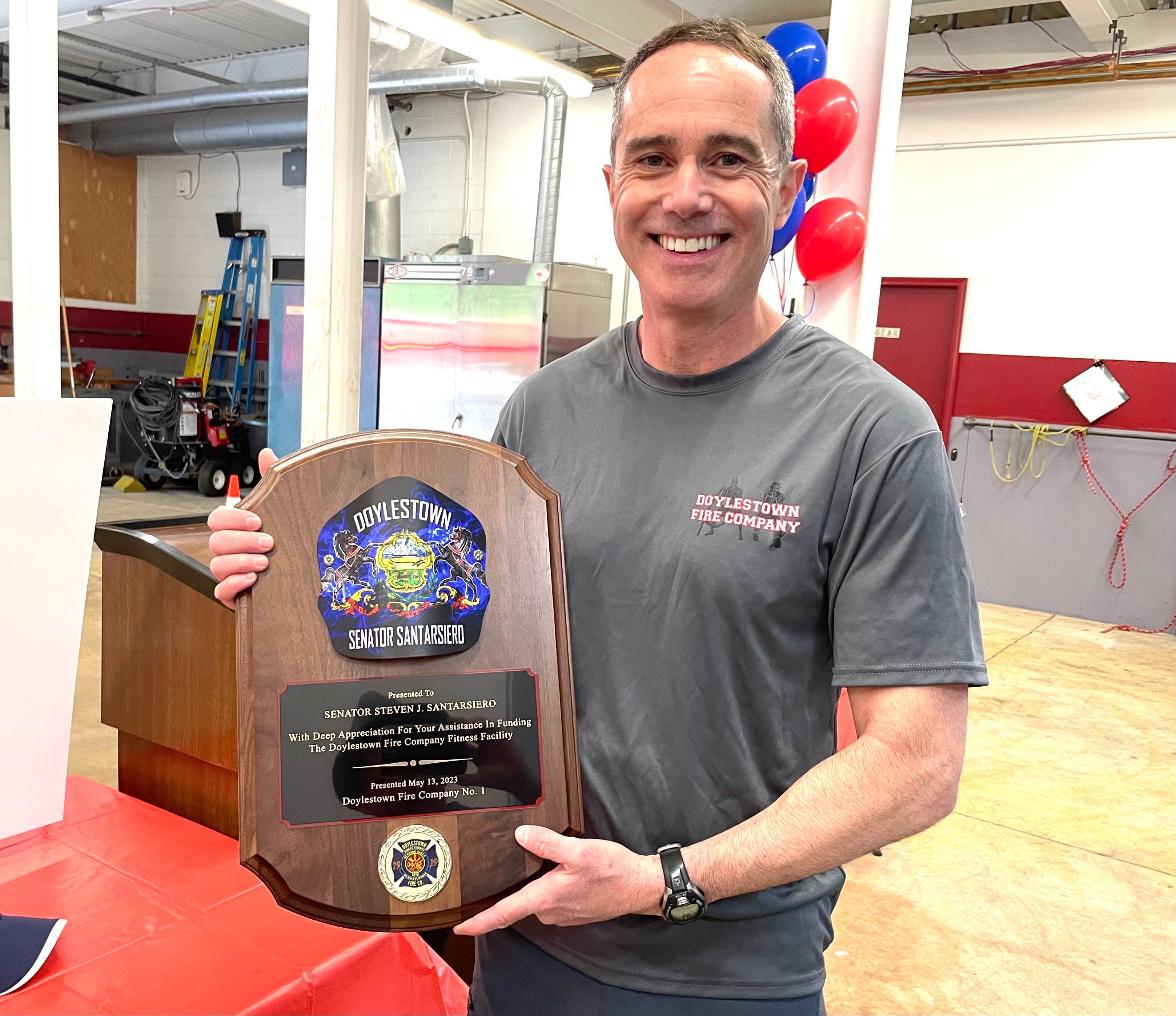 The firefighters presented State Sen. Santarsiero with a plaque "with deep appreciation for your assistance in funding the Doylestown Fire Company Fitness Facility."