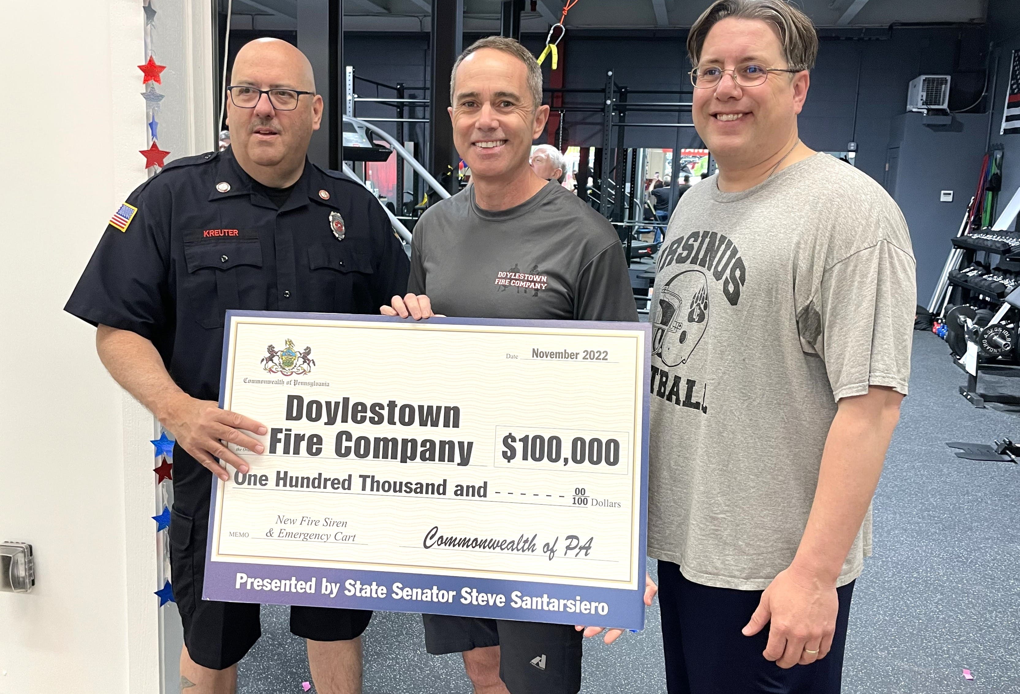 State Senator Steve Santarsiero, center, and State Rep. Tim Brennan present fire company president Paul Kreuter with a check for $100,000 for a new fire siren and emergency cart.