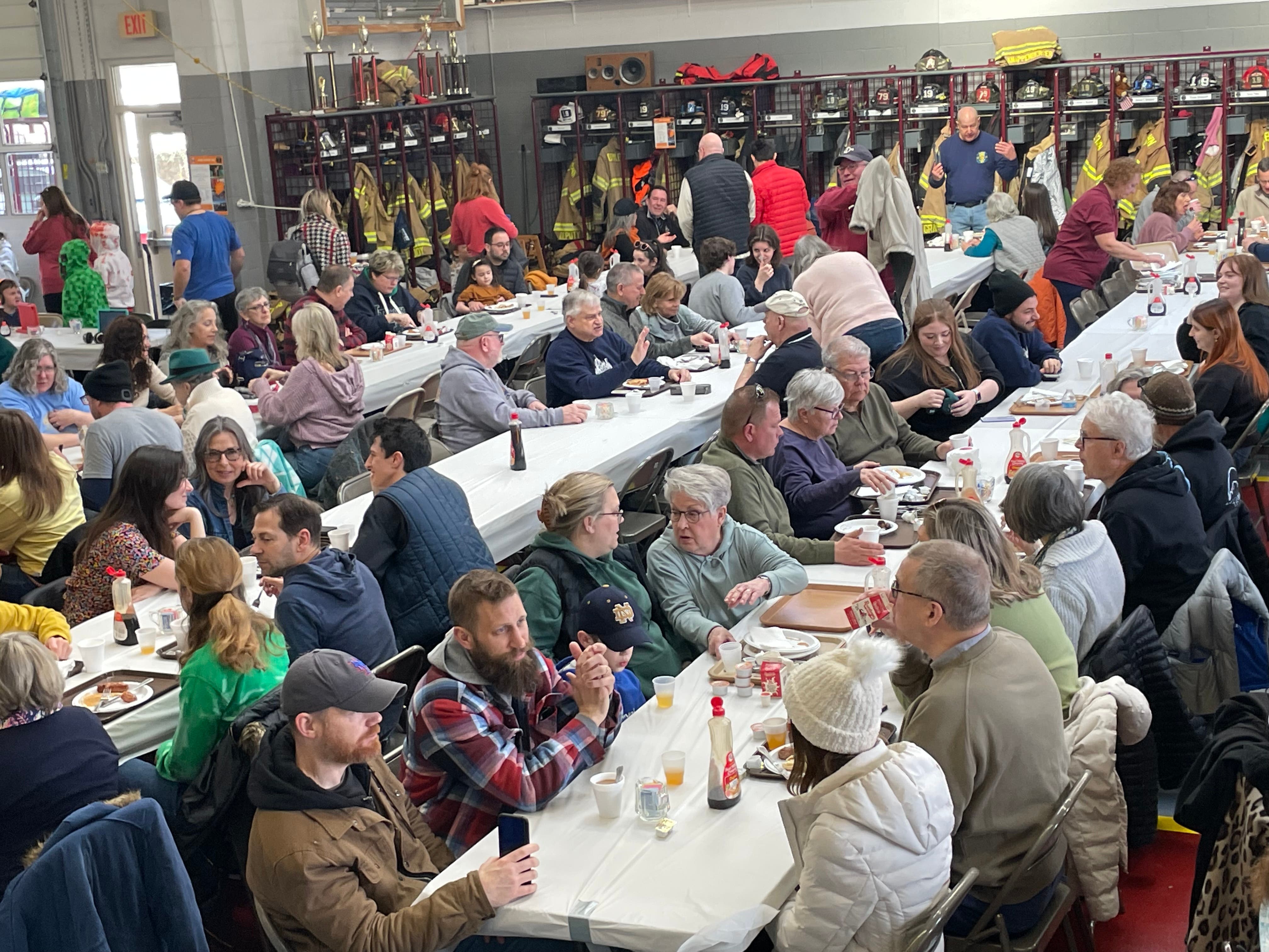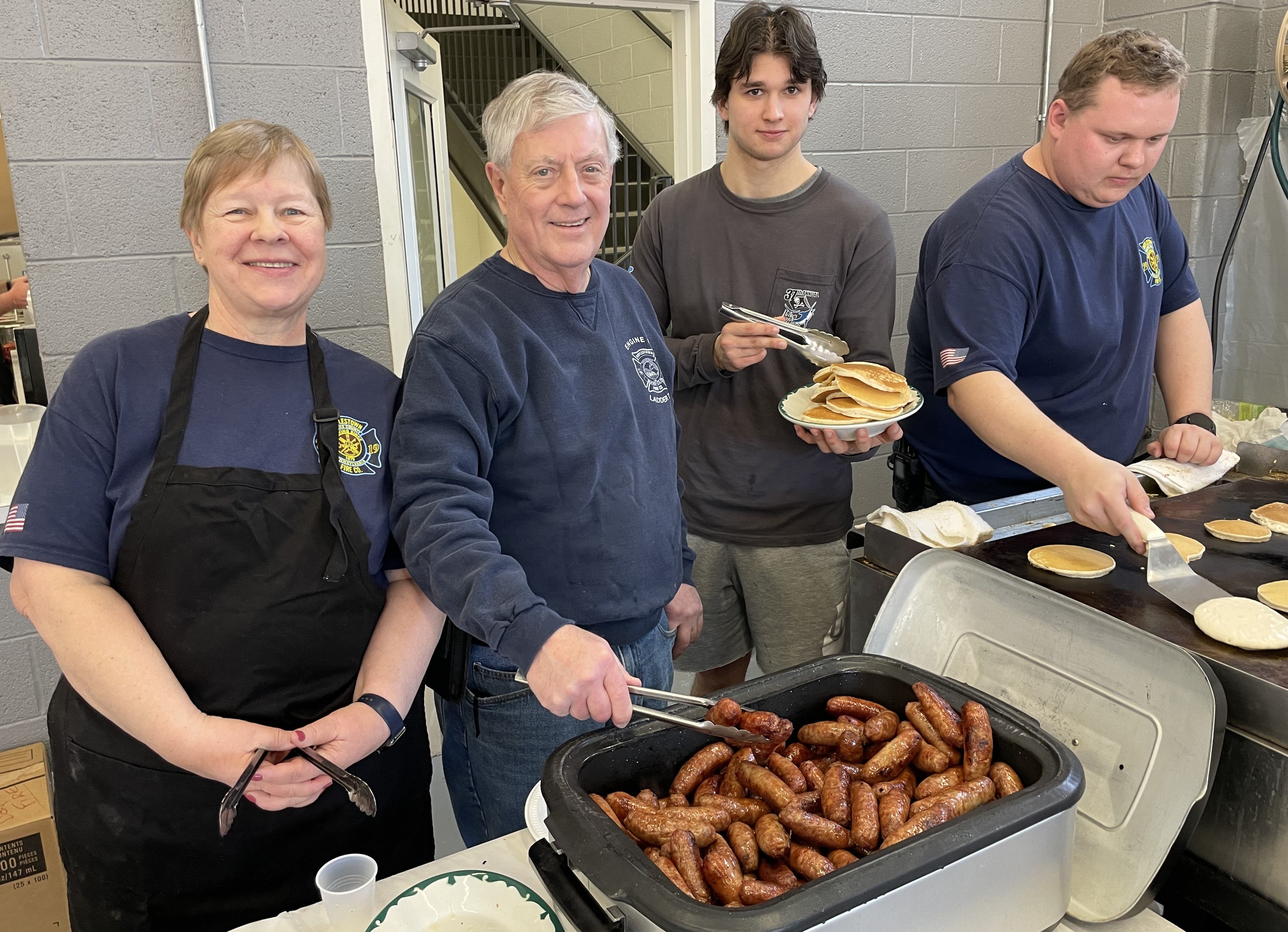 The fire company's auxiliary organizes the breakfast, but it takes the entire fire company to make it happen, from the volunteers flipping the pancakes to grilling the sausage and cleaning the grills at the end of the breakfast.