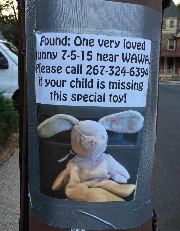 A “very loved bunny” was found July 5 near Wawa, a poster in town says.