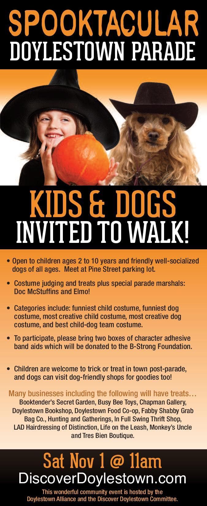 Keep the Halloween Fun going! Please join The Merchants of Doylestown on Saturday 11/1 at 11:00am for a fun-filled Kids and Dogs Spooktacular Parade! We’ll assemble at the Pine Street parking lot (at the intersection of Pine & State Sts.) and then stroll down State Street, turning left on Main Street and ending in the Doylestown Historical Society Park for costume judging and treats. Categories include: funniest child costume, funniest dog costume, most creative child costume, most creative dog costume, and best child-dog team costume.