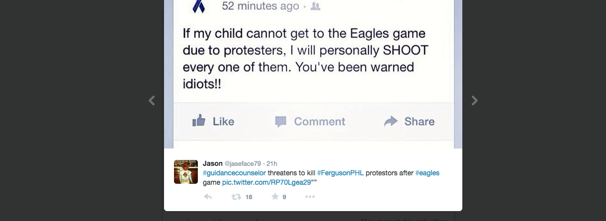The post was then shared on Twitter by a user with this caption: “#guidancecounselor threatens to kill #FergusonPHL protestors after #eagles game.”