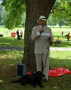 A cabinet-maker by day, Bradley uses his years of community theater experience to transform into the man with the mustache for special events at , and .