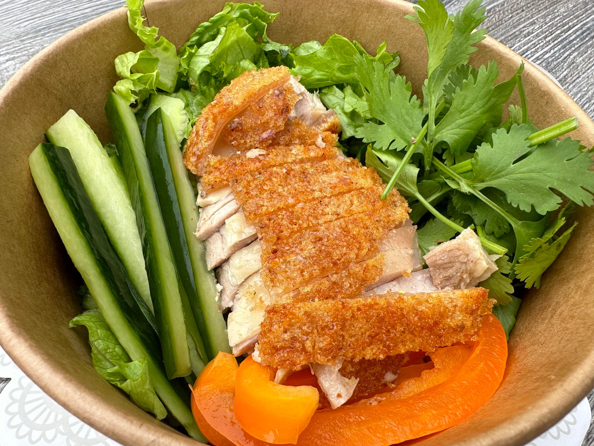 Create your own bowl rice bowl with crispy pork, cucumber , lettuce , cilantro , and orange bell pepper. (TeaVa Rolls)