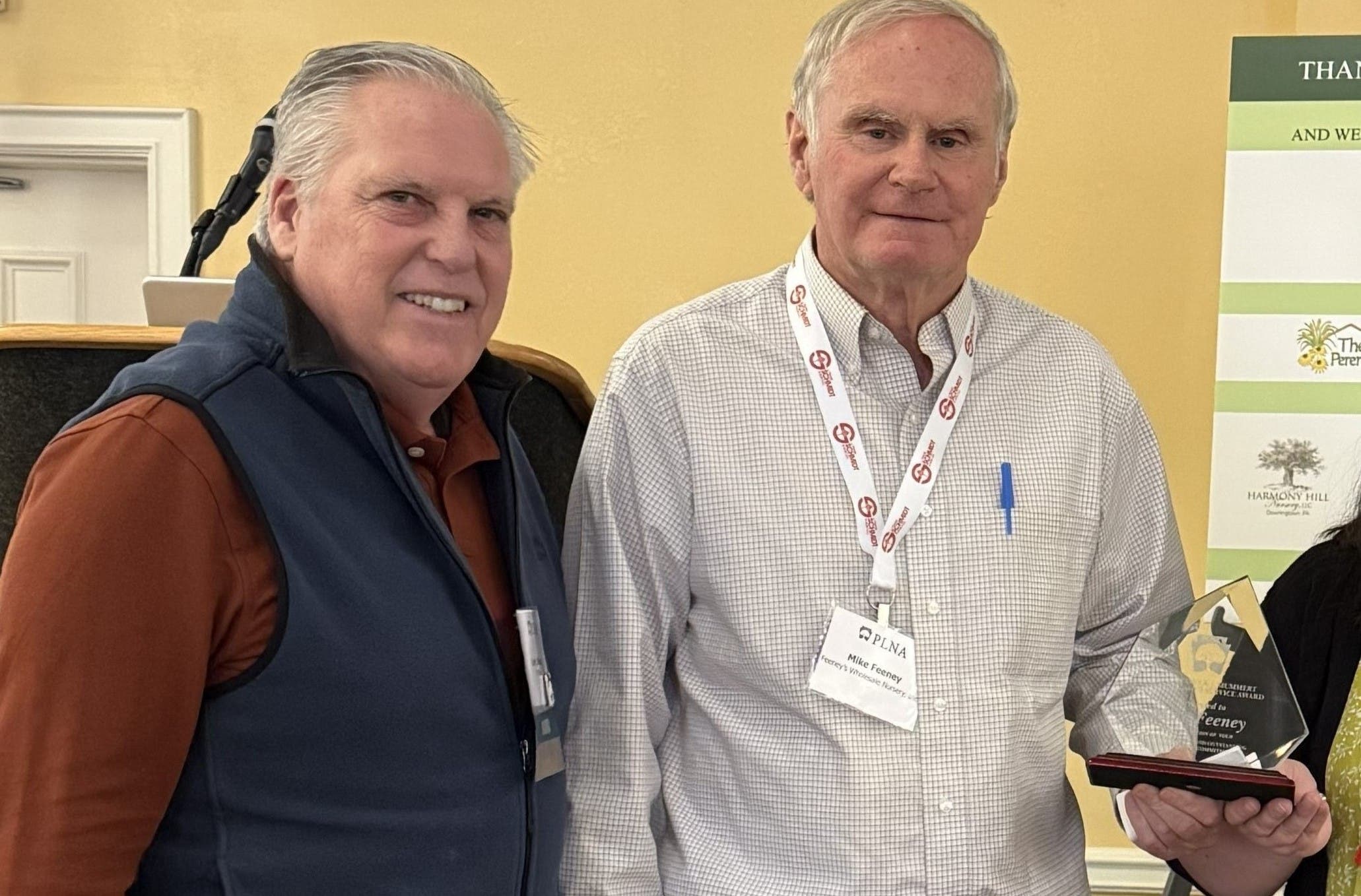 Larry Shehan, left, Pennsylvania Landscape & Nursery Association (PLNA) Vice Board Chair, presents Mike Feeney with the award. (Pennsylvania Landscape & Nursery Association)
