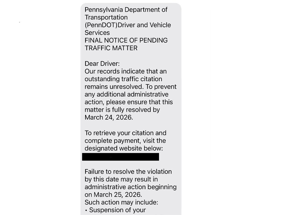 PENNSYLVANIA — Drivers are being warned about text phishing scams targeting Pennsylvanians that threaten the suspension of driving and vehicle privileges for not paying a fine or toll violation.