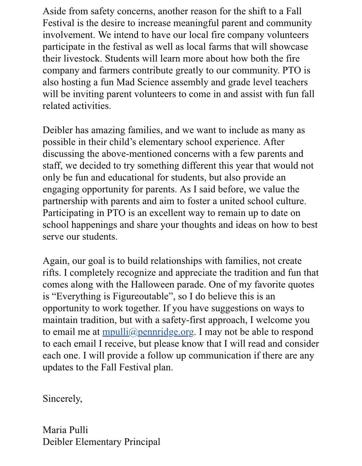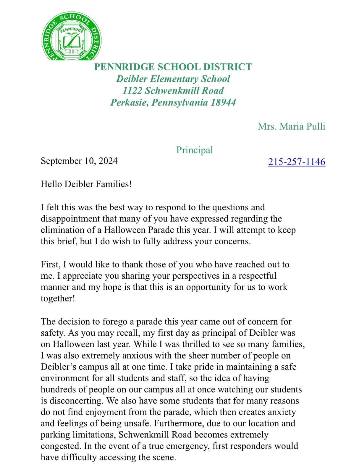 Maria Pulli, Deibler Elementary Principal in the Pennridge School District, sent emails to families of all 400+ students this week saying the Halloween Parade, which dates back over 60 years, will not happen this year.