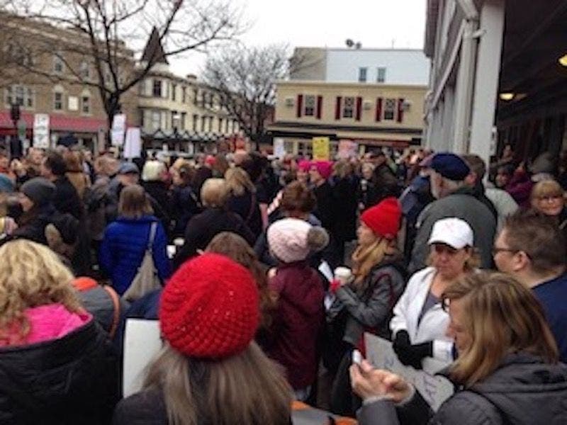 On January 21, 2017, Republican politicians got a dose of reality. Washington, DC saw a crowd that the Trump administration would have liked to have seen at the Inauguration. In Philadelphia, New York, Atlanta, Seattle, Los Angeles, and in pouring rain in San Francisco, the people marched. Roads had to be closed, traffic re-routed and yet the people marched. The crowds were noisy with conversation, full of ideals, and united in sending their message. Here in Doylestown hundreds of men, women and children gathered and sang. It was an old song and everybody knew the words. This land is our land.