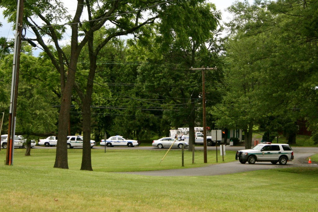 The road was closed after a Bucks County truck carrying a backhoe exited the driveway near the Moravian Pottery and Tileworks. The truck inadvertently pulled down some overhead wires, police said.
