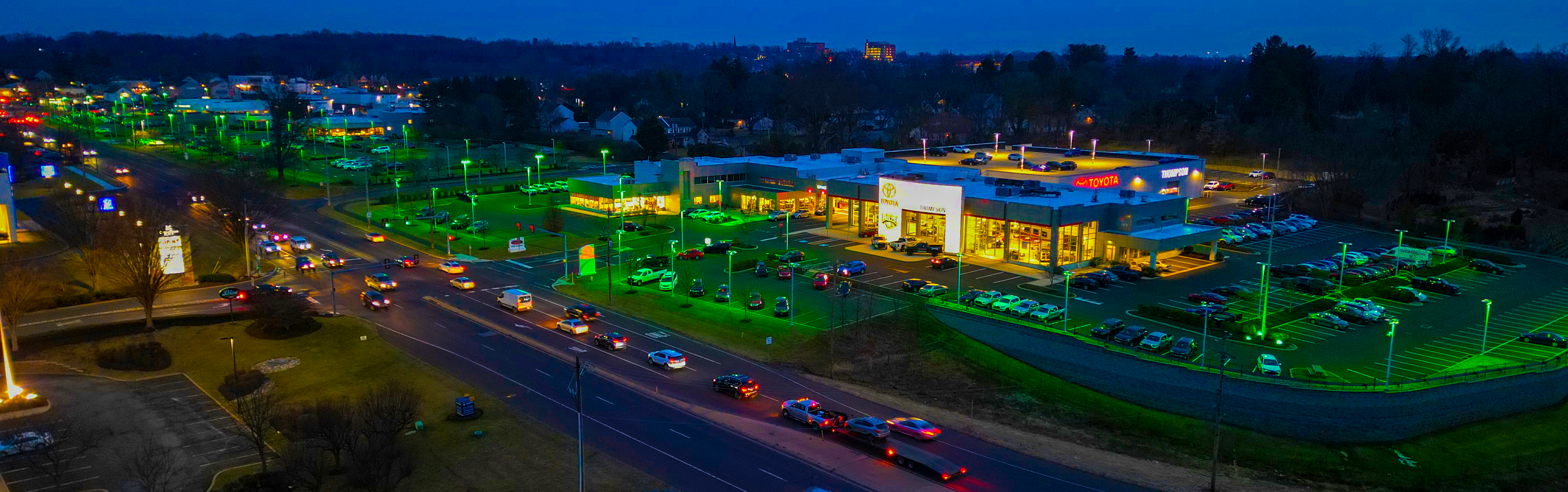The green glow can be seen at Thompson BMW, Thompson Lexus and Thompson Toyota, Routes 313 and 611 in Doylestown, and at Thompson Lexus Willow Grove, Route 611 at the Pennsylvania Turnpike.