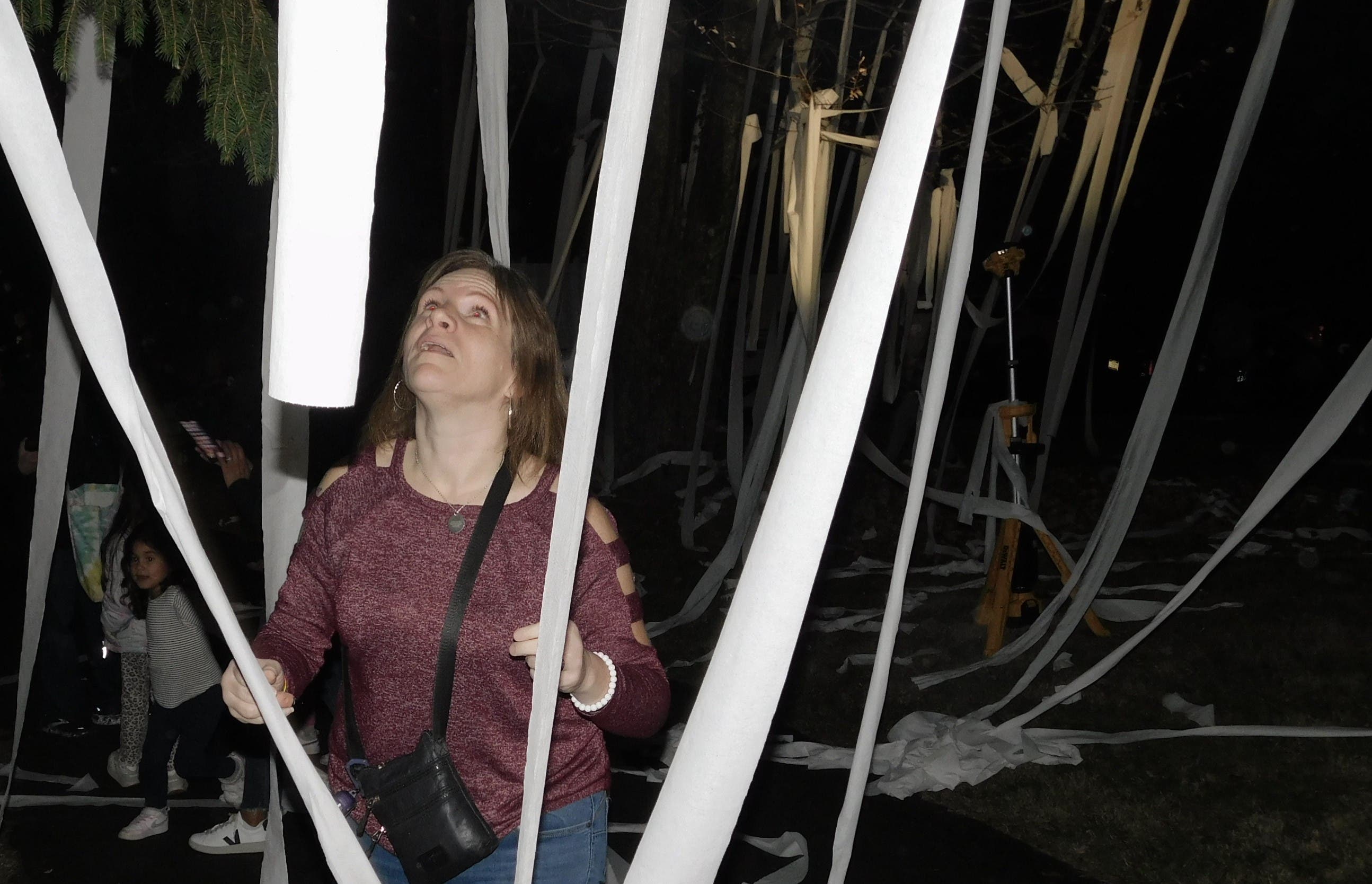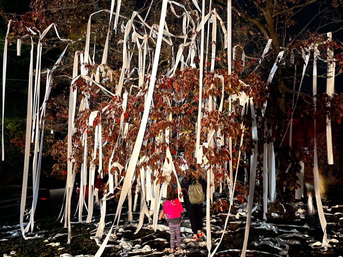 The white tissue paper was hanging from the trees, the roofline, the electric wires, the rain gutters. It even covered the car, a sign, the fence and the bushes.