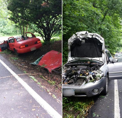 Two people were injured Monday morning after a tree fell on their cars on Route 32, Solebury Police said.