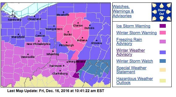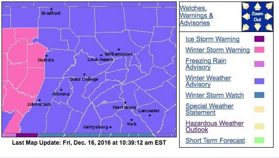 The National Weather Service has issued a "winter weather advisory" for eastern and central Pennsylvania that will remain in effect from 10 p.m. Friday evening until 2 p.m. Saturday. A "winter storm warning" is in effect for the Pittsburgh area.