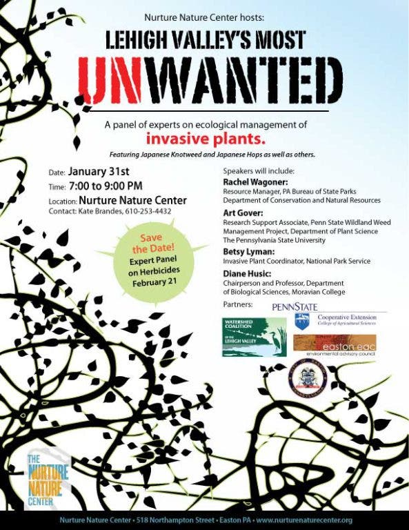 While weeds can be frustrating and time consuming, invasive species can wreak havoc on natural ecosystems. How to remove invasives from our yards and public lands also raises many thorny questions. Invasive plants can present substantial ecological, economic and social consequences for our Lehigh valley communities. To find out more, come to a special panel discussion on Invasive Plants from 7:00 to 9:00 PM on Thursday, January 31st at Nurture Nature Center located in Easton (http://nurturenaturecenter.org/).