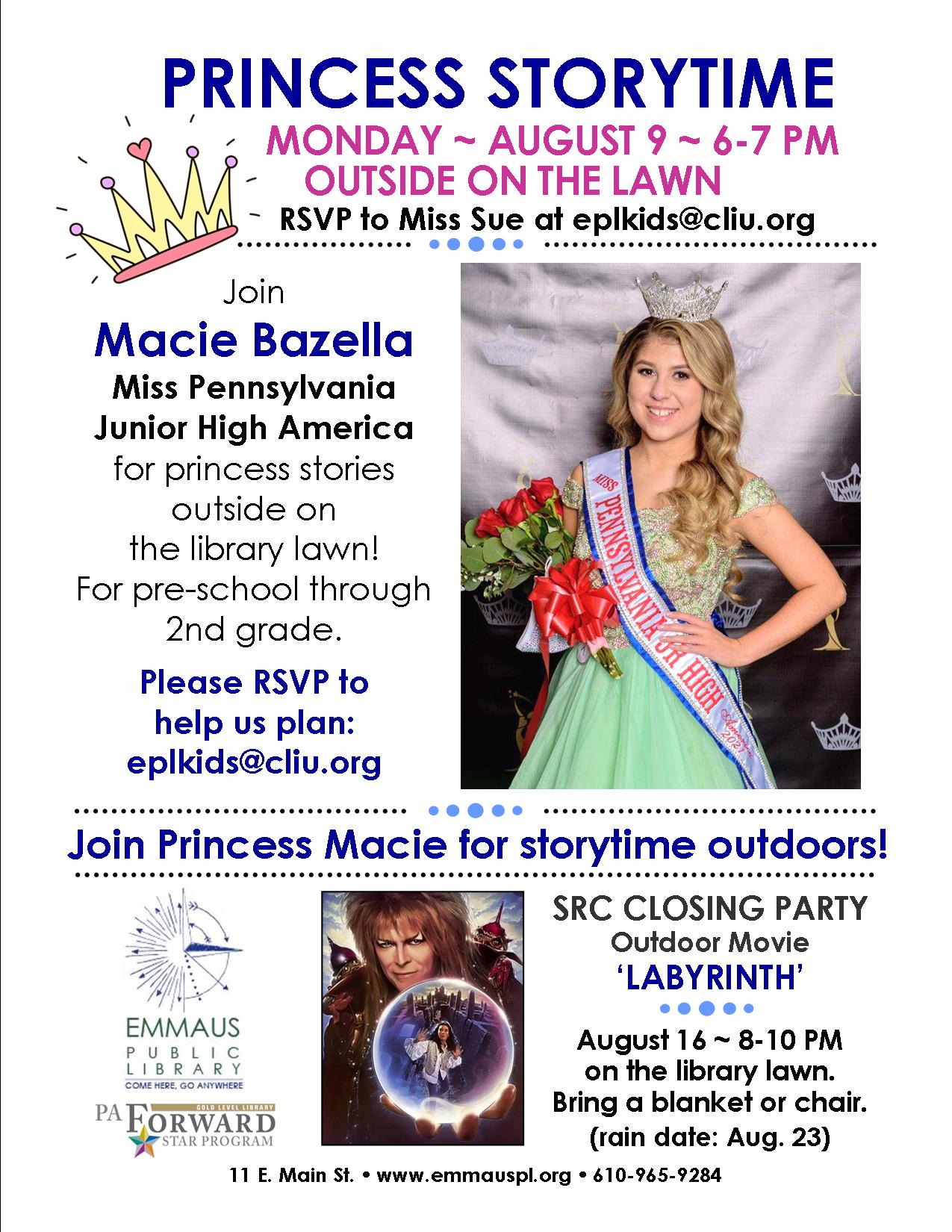 Happy Monday! EPL director Maryellen Kanarr fills in this week for Miss Sue, who is traveling back from Otakon, a huge anime convention in Washington, DC. Maryellen fills us in on all the cool things going at the library this week and beyond — including ‘Princess Storytime’ tonight at 6 p.m. with Macie Bazella, Miss Pennsylvania Junior High America, and the SRC Closing Party next Monday!