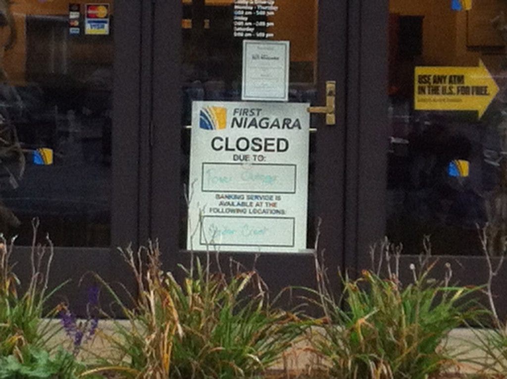 The bank on Lehigh and Harrison Streets in Emmaus is closed. A sign posted in the window says the closure is due to a power outage. But a customer told a Patch reporter that he was able to use the ATM machine, which surprised him if the power is indeed out.