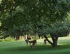 Then, when it was time for a snack, the fawns headed back to the full-grown apple trees and plucked off some more leaves or apples to eat. As they bit into a juicy, yellow apple, we heard a crunching sound as their jaws moved from side to side chewing and savoring every bite.