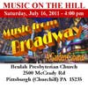 Beulah Presbyterian Church invites you to a Garden Cabaret, another in the Music on the Hill series! "Music from Broadway" is the theme and you will recognize your favorites, including selections from Cabaret, Sound of Music, Porgy and Bess, Candide, The Secret Garden, Children of Eden, The Fantasticks and more. Songs will be performed by ten of Pittsburgh's top musical theater stars including Denise Sheffey-Powell, Gail Novak, Carly Black, Mary Randolp, David Jennings Smith, Jim Critchfield, Rob Frankenberry, Todd Farwell, Rob Pruitt, and JRichard Szeremany.