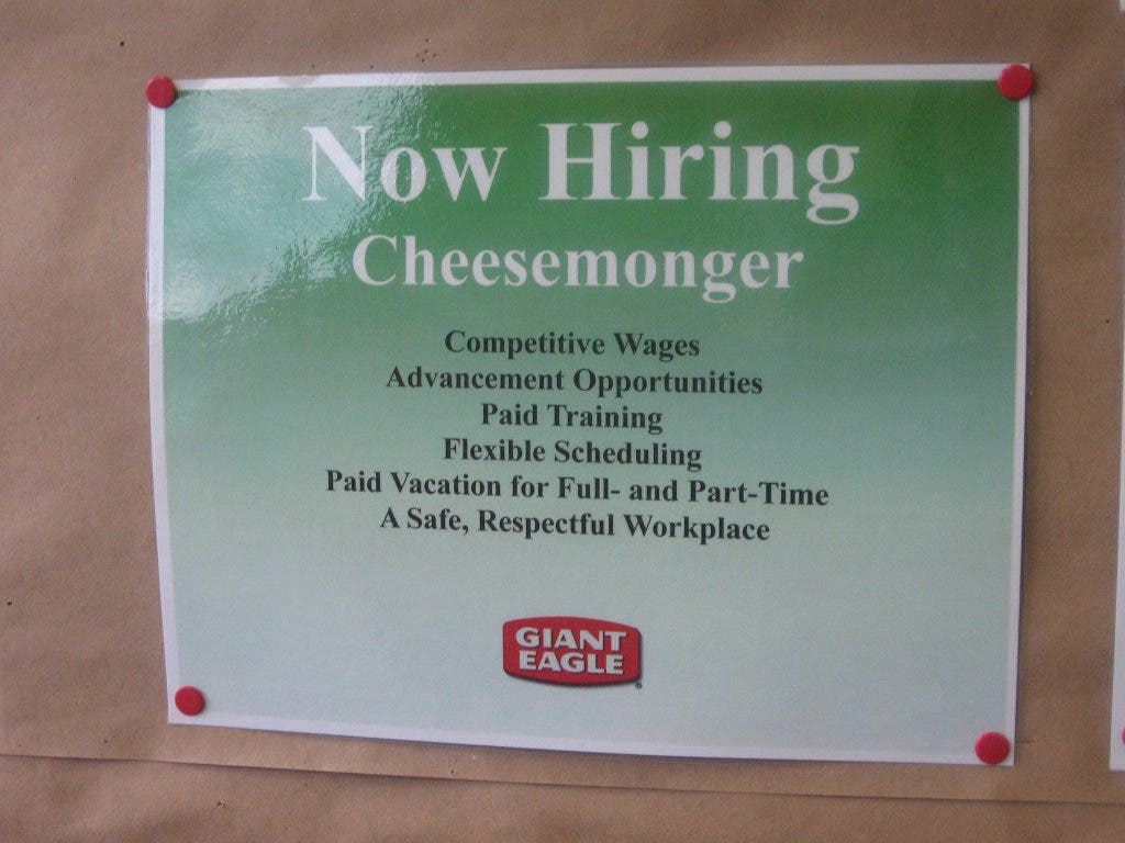 When her brother, grandmother and I were at the Edgewood Giant Eagle, we did see a job posted that would be perfect for her: Cheesemonger.