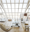 The above airy loft is a converted barn (old), the floors are reclaimed wood, as are the bench and the table. The coffee tables are a combination of old casters and new tempered glass, and the chairs are vintage. All of the accessories have been around for quite some time, but have found new appointments.