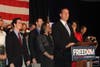 Joined on stage by his wife and children, Santorum did not mention Romney in his speech to supporters. He told them that Americans need a leader who is able to stand strong without making concessions in the face of government-controlled health care.