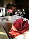 The decor is quite pink, with pink tablecloths and magenta cloth napkins. Each table had a lone pink carnation as decoration. There are small paintings and living green plants throughout the dining area. Off white and stone walls add a sort of cabin feel to the space. Natural sunlight and candlelight combine to add a warm glow to the dining room. It's definitely a comfortable and welcoming space.