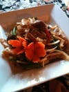 We ordered the chive dumplings, fried calamari and green papaya salad to start. The chive dumplings were excellent. Each one had a wonderfully crisp exterior, slightly chewy wrapper and interior bursting with well seasoned sauteed greens. The sweet soy dipping sauce was tasty but not necessary as these were enjoyable enough on their own.